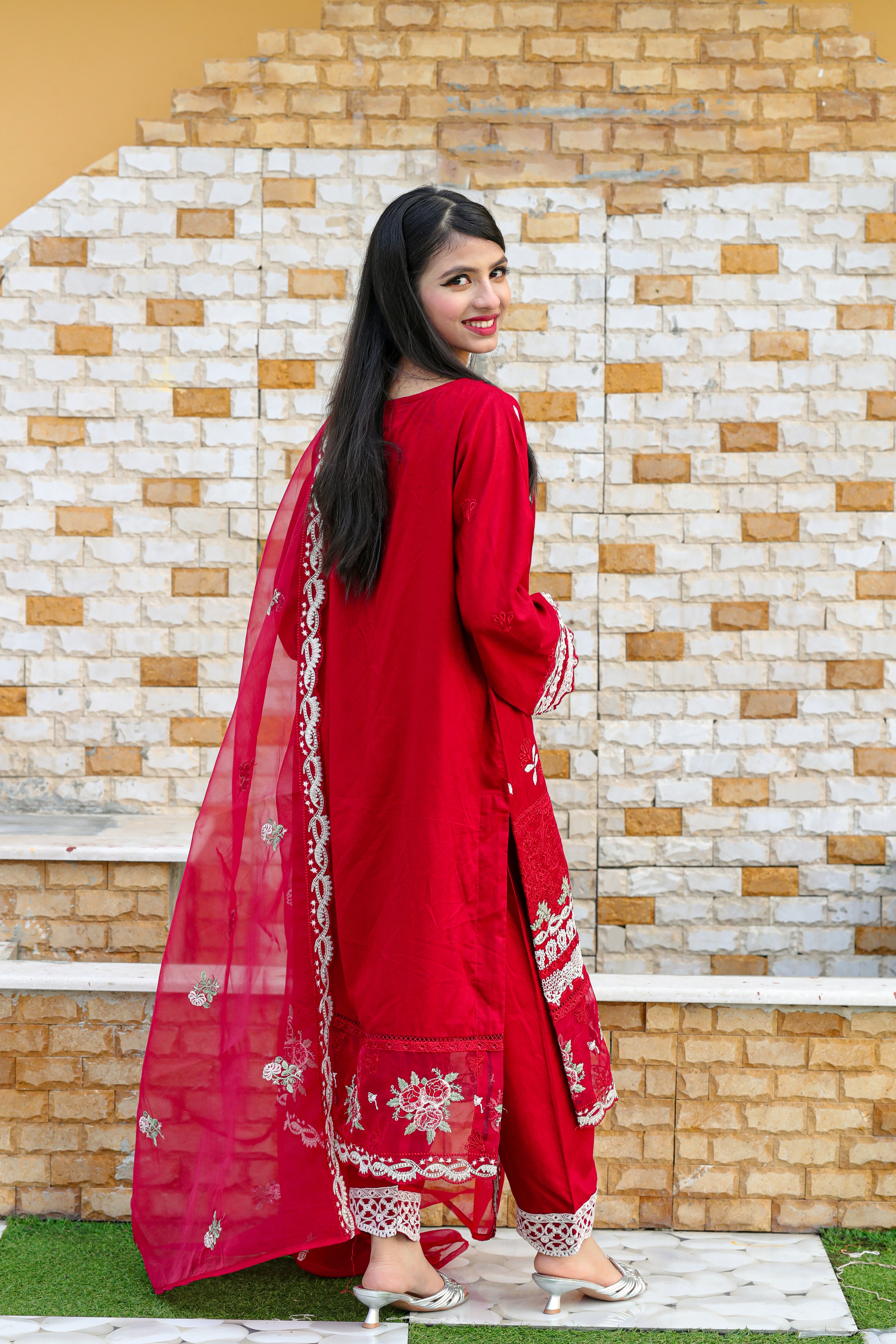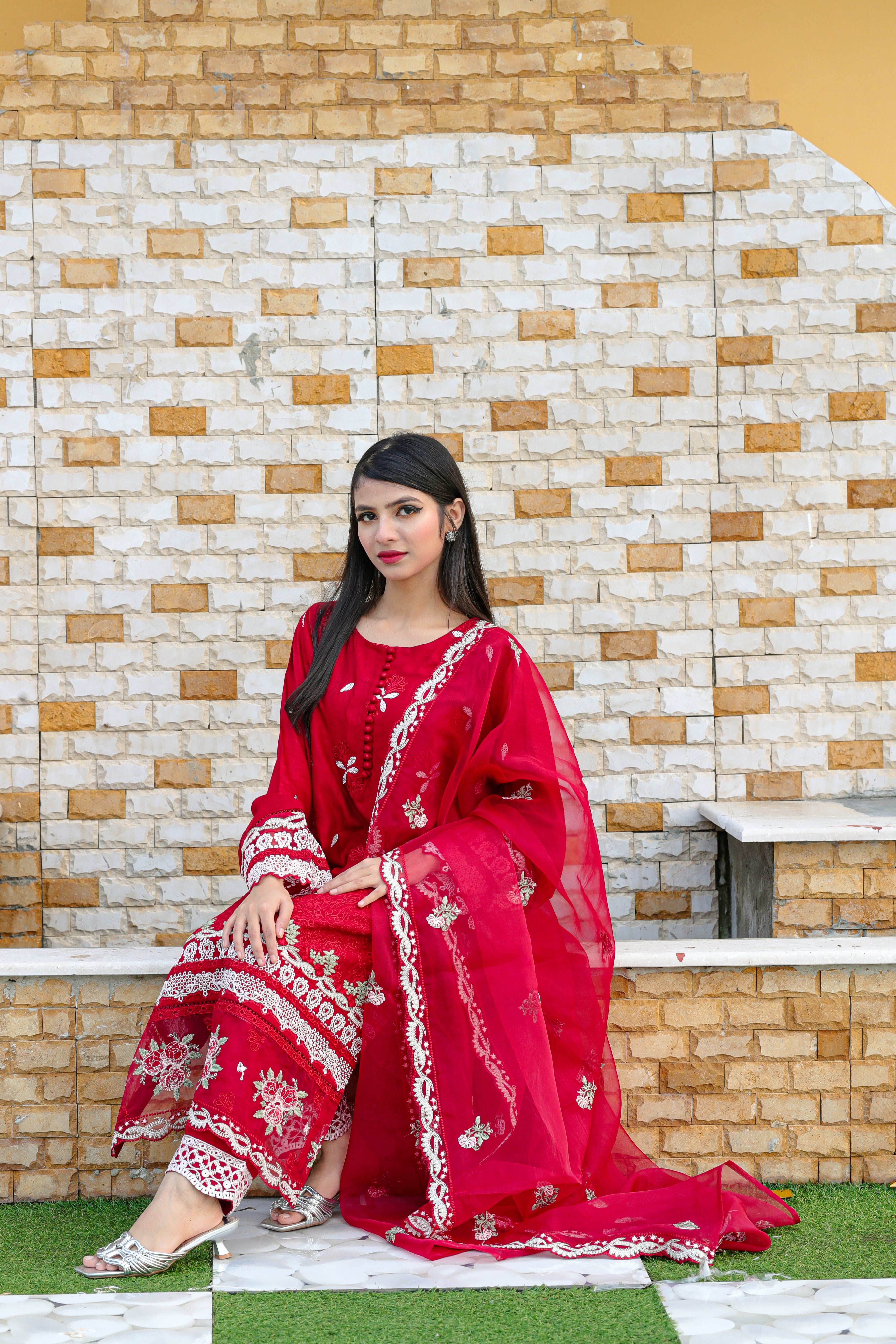 Step into elegance with this stunning red linen 3 Piece from POSHAKEHUSAN. The kameez features delicate white embroidery, complemented by a beautifully embroidered organza dupatta for an elevated look ❤✨