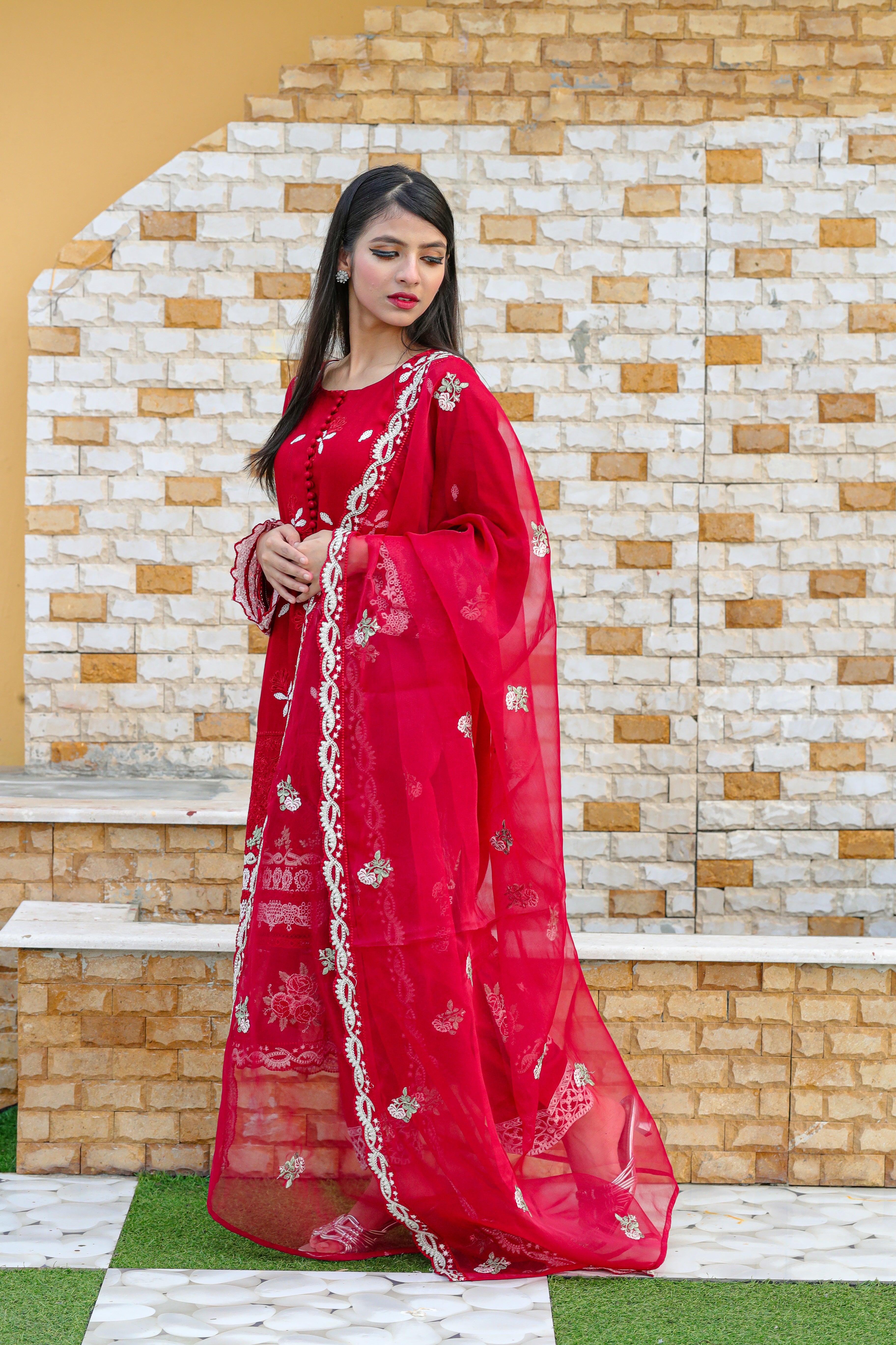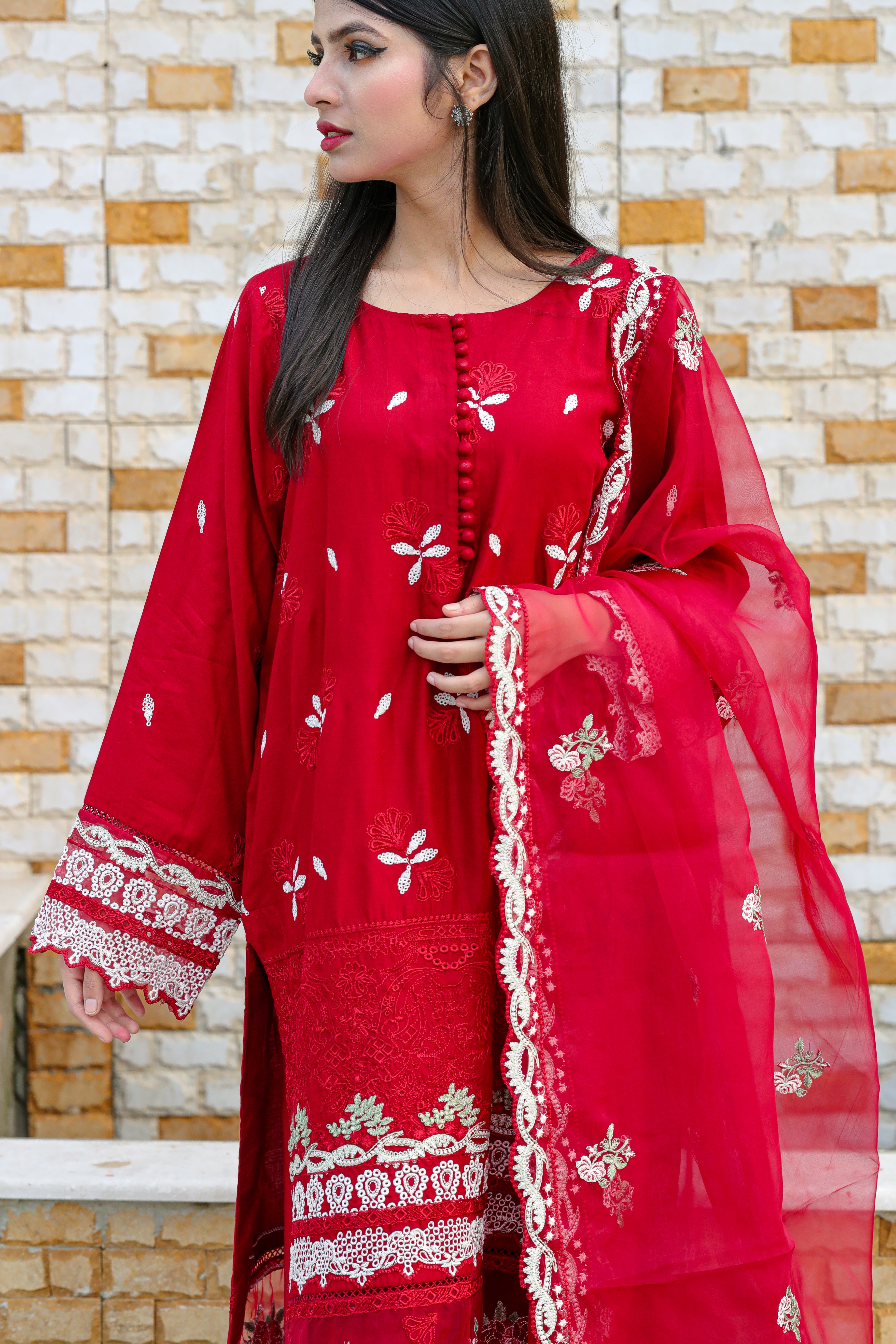 Top Fabric: Premium Linen | Red Base | White Embroidery | Stitched Kameez