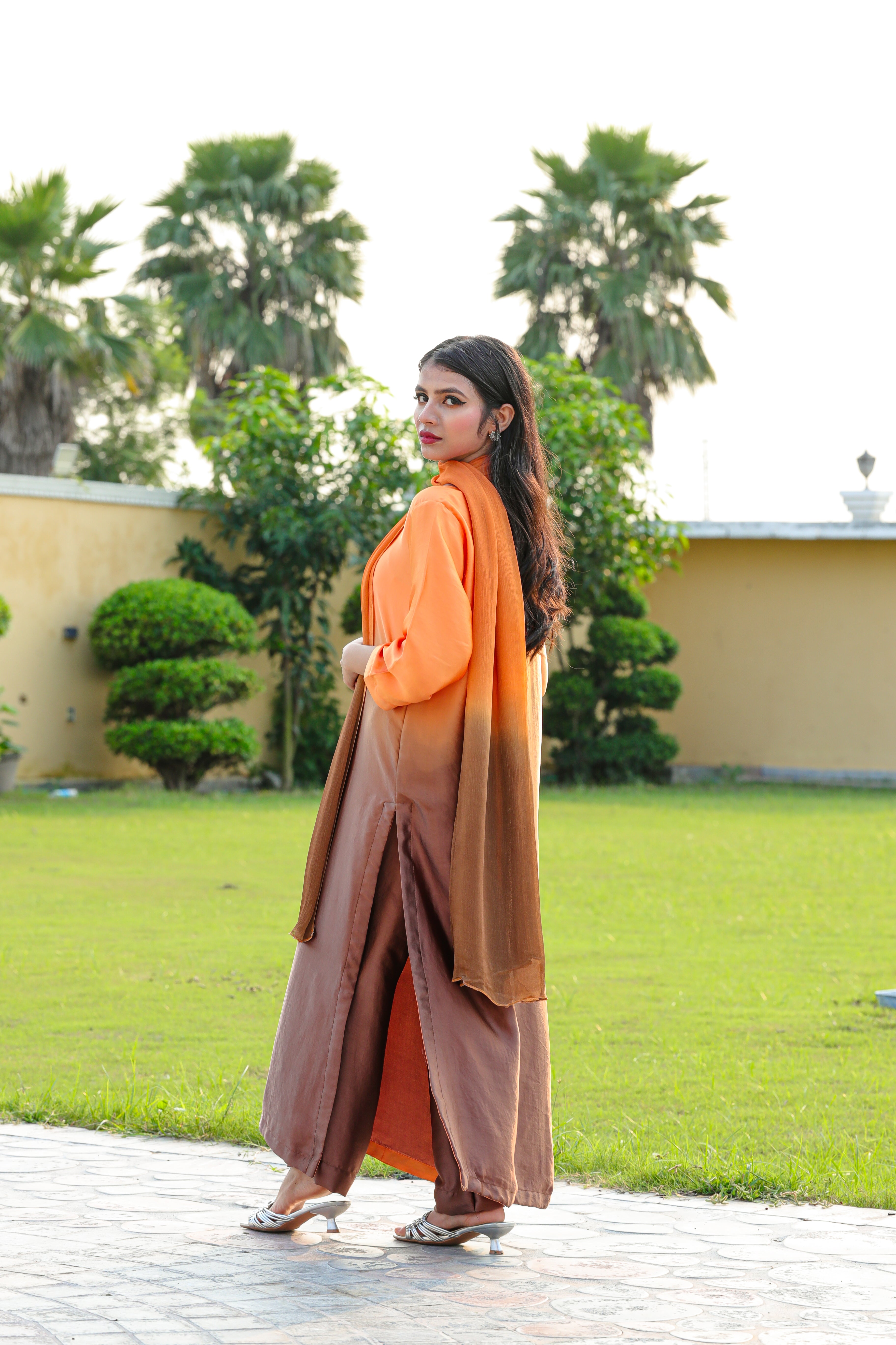 Infuse vibrance into your wardrobe with this stunning orange Korean silk three-piece suit from POSHAKEHUSAN. Crafted from soft, lustrous fabric, this stitched ensemble radiates elegance.